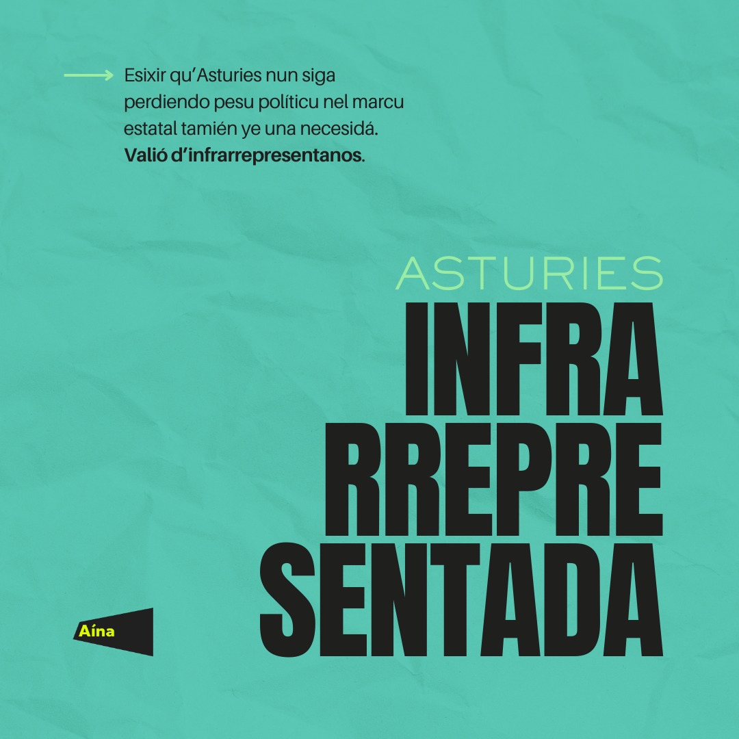 Con too ello, dende Aína entienden que ye menester algamar un consensu políticu nel que los diputaos y les diputaes electos d’Asturies se comprometan a defender nel Congresu los intereses de les asturianes y reclamar un repartu d’escaños xustu qu’evite la infrarrepresentación y que garantice el pesu políticu que-y corresponde a esti territoriu nel marcu estatal. Ye dicir, asegurar qu’Asturies caltenga la so representación actual, nun pudiendo perder nengún representante más y afitando el númberu actual como una cuota de poder territorial mínima independiente de la continua baxada de población.